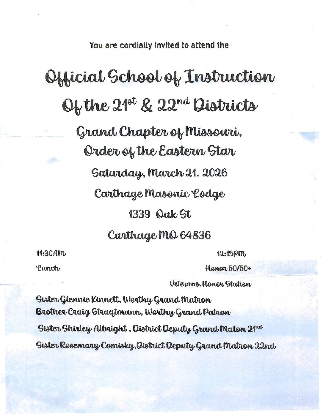 21st-22nd School of Instruction 11:30 am – 4:30 pmMarch 21, 2026 Carthage Masonic Lodge1339 Oak StreetCarthage, Missouri 64836View LocationMap Carthage Masonic Lodge iCal Google View full calendar