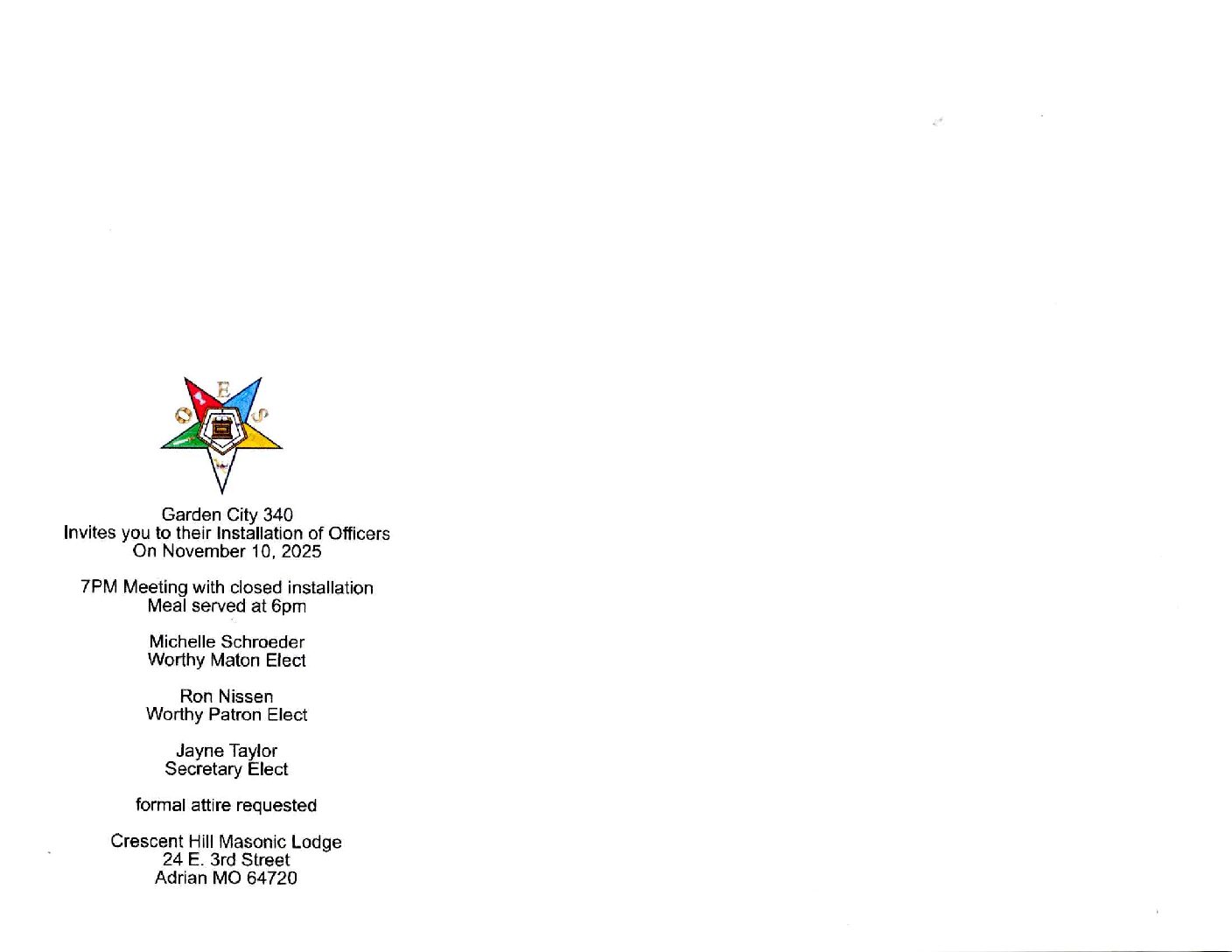 Category: General Installation of Officers Garden City #340 by Michael Ham | Oct 9, 2025 Installation of Officers Garden City #340 7:00 pm – 10:00 pmNovember 10, 2025 Garden City-Crescent Hill Masonic Lodge24 E 3rd StreetAdrian, Missouri 64720View LocationMap Garden City-Crescent Hill Masonic Lodge iCal Google Calendar View full calendar